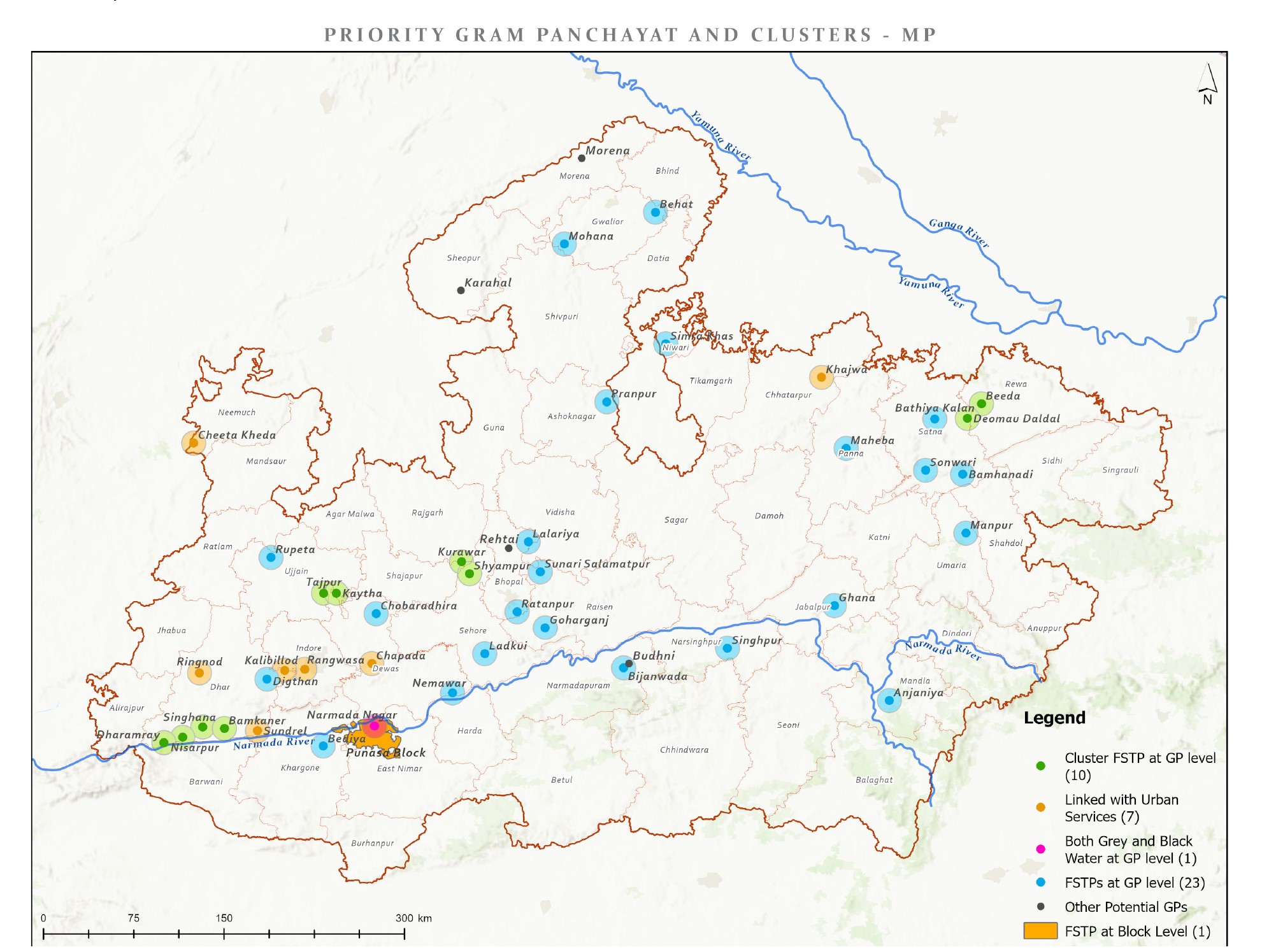 The Map illustrates the identification of Priority Gram Panchayats (GPs) for the phased implementation of sanitation systems across the state of Madhya Pradesh. The listing is the result of a comprehensive evaluation process, involving parameters such as population, block density proximity to tourist locations, industries, ground water table, proximity to water bodies, flood risks, and proximity with urban services.